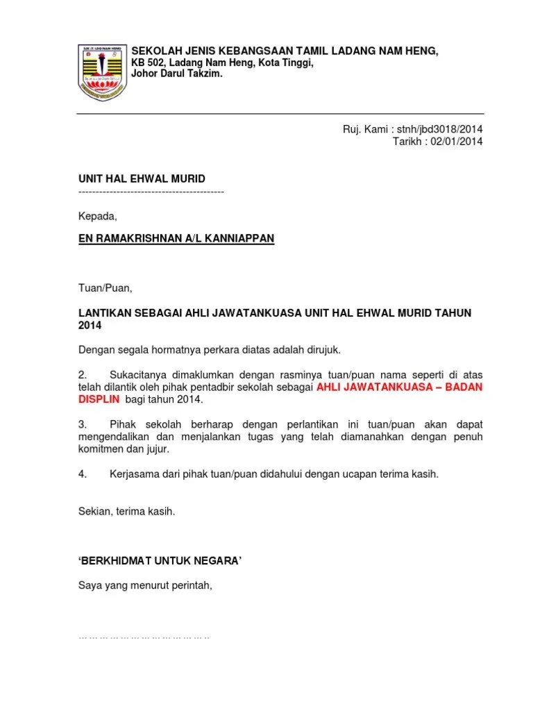 Contoh surat lantikan ajk pibg surat pelantikan jawatankuasa. Surat pelantikan puan maryanti@mardhiyyah binti abd malek.